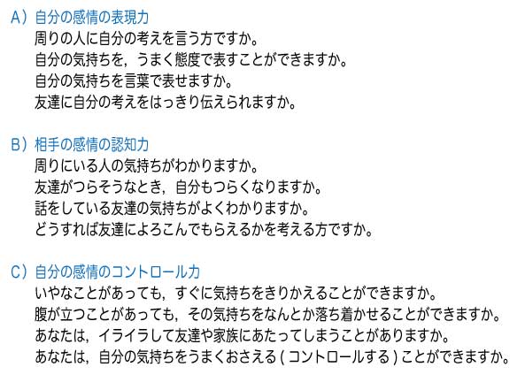質問紙テストは,すでに作成されたEI質問紙(箱田・小松・中村, 2010)を使用しました。この質問紙により,3つのEIが測定されます。