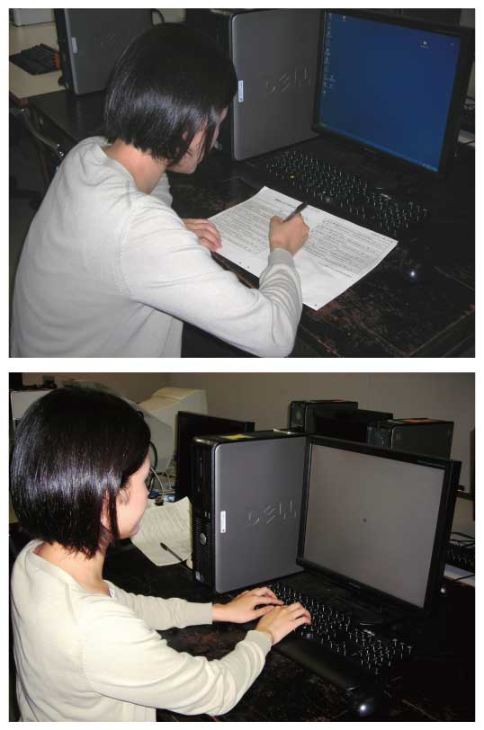 表情は無視して単語の快不快判断(単語の意味がポジティブな意味か,ネガティブな意味か)を行うことで,EIの感情のコントロール力を測定します。コントロール力が高い人は,感情を表している表情を無視する能力が高いため早く判断ができますが,コントロール力が低い人は,表情に引きずられて単語の判断が遅くなると考えられます。