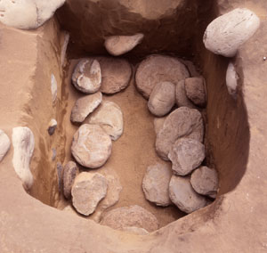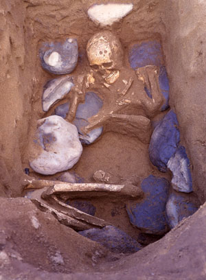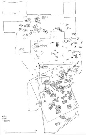 | 佐賀県東松浦郡呼子町大友に所在する遺跡。 佐賀県教育委員会による、1968年から1981年の4次にわたる調査で、弥生時代から古墳時代にかけての墓地であることが判明していました。しかし、山際で1基だけ検出された57号支石墓と他の土坑墓や甕棺墓、石棺墓などとの関係は不明確なままでした。そこで、九州大学考古学研究室を主体として、1999年に5次、2000年に6次発掘調査を行いました。その結果、4次調査で検出されていた57号支石墓の北側に10基の支石墓(しせきぼ)、8基の土坑墓、3基の甕棺墓、2基の石棺墓などが検出されました。遺物には、副葬小壷・甕棺・管玉・貝輪などがあります。この調査によって、4次調査までの墓地と5・6次調査の墓地の関係が判明し、縄文時代晩期終末から古墳時代にわたる墓地の変遷が明らかになりました。また、墓地から出土した人骨は、縄文系の形質であることが分かりました。人骨の安定同位体分析からは、当初漁労活動による海産物に依存していた食生活が、しだいに穀物依存の度合いを高めたことが示唆されました。 |