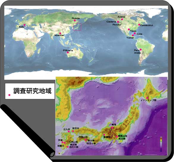 - 実際の地球を野外調査(地質調査)から研究していくとき、そこには、時間軸の入った4次元の地球を実感できる。地球の歴史をひも解くためには、さまざまな時代の地球上に残った地層に残る当時の記録を解読していかねばならない。