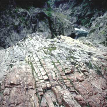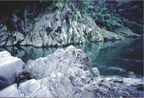 この礫岩はジュラ紀の終わり頃、古アジア大陸から深海底にもたらされた土石流堆積物である。ジュラ紀の深海底はその後の地殻変動により隆起して、現在岐阜県の険しい山々を作っている好例である。 |