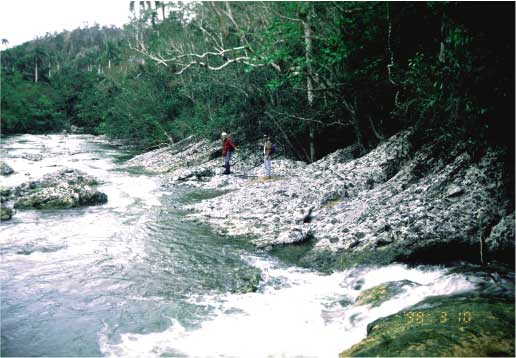 | 白亜紀の終わりに、ユカタン半島チュチュラブに隕石が落下した。この出来事を境に恐竜をはじめとする大絶滅が起こった。キューバは当時ユカタン半島に最も近く、隕石落下の影響を直接受けた地層が残っている。川沿いには隕石衝突による大崩壊によりできた礫岩層が厚く分布している。礫岩中の礫と礫のあいたを埋める泥岩から隕石衝突に特有の衝撃石英・スフェルール(蒸発した岩石が吸着して丸い粒子になったもの)が見つかっている。 |