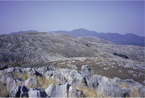 (パンサラッサ海) の海山上で、石炭紀・ペルム紀の間形成された。堆積当時は赤道付近の熱帯域に位置していたと考えられている。その海山がプレート運動によって、移動し付加することによって、日本列島の一部になった。現在、この3億年前の海山である秋吉台は、広大なカルスト地形をつくり、特別天然記念物として保護されている。 |