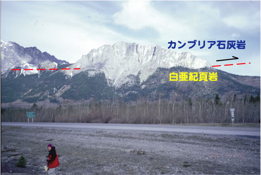 カンブリア紀中頃(約5億3000万年前)の石灰岩が、ほとんど水平のスラスト断層に沿って、白亜紀後半(約7500万年前)の砂岩・泥岩の上に重なっている地質構造。植生の違いに注目。