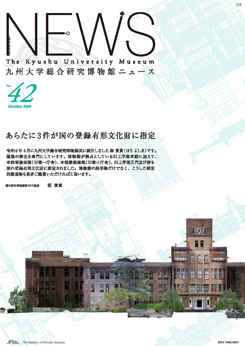 ・あらたに3件が国の登録有形文化財に指定 ・着任のご挨拶と研究紹介 博物館長挨拶 堀 賀貴 総合研究博物館第10代館長 ・受賞報告 動物学教育賞を受賞して~これまでの展示を振り返って~ 丸山 宗利 分析研究部門・准教授 ・催事・展示クローズアップ 開催報告 令和5年度公開講演会 フィールドの学ー古生物学と考古学ー 福永 将大 開示研究部門・助教 博物館特別公開 福岡ミュージアムウィーク2024 伊藤 泰弘 開示研究部門・教授 開催報告 令和6年度公開講演会 まちとミュージアムー共創協学の場の創出にむけてー 三島 美佐子 分析研究部門・教授 開催報告 令和6年度公開展示 九大1万年史ー発掘された九州大学筑紫キャンパス内の遺跡ー 福永 将大 開示研究部門・助教 開催報告 附属図書館貴重文物展示 「続・雅俗繚乱ー江戸の秘本・珍本・自筆本ー」 兵藤 健志 附属図書館利用者サービス課専門員 開催報告 史料保存運動の軌跡が紡ぐものー九州文化史90周年記念展ー 根嶋 政司 附属図書館付設記録資料館 九州文化史資料部門・助教