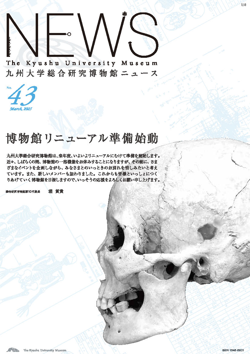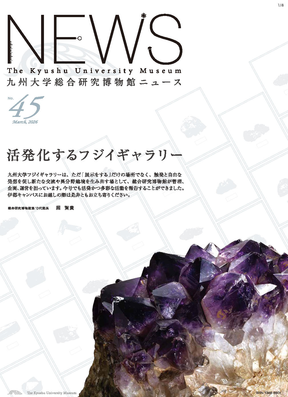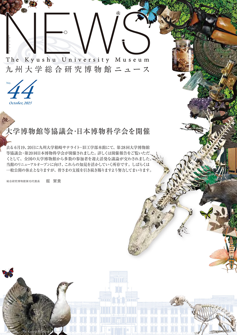 ・博物館リニューアル準備始動 ・催事・展示クローズアップ 開催報告 九州大学総合研究博物館×NHK「バックヤード探検隊」 福永 将大 開示研究部門・助教 フジイギャラリー展示開催報告 弥生時代の人々 ー九州大学の自然人類学研究ー 米元 史織 開示研究部門・准教授 白川英樹博士ご見学 丸山 宗利 分析研究部門・准教授 展示案内 元寇防塁研究と九州大学 福永 将大 開示研究部門・助教 開催報告 令和6年度文化庁 Innovate MUSEUM事業での「リアル催事連携」 二宮 聡 技術職員・文化庁事業コーディネーター フジイギャラリー展示開催報告 フジイギャラリー展示開始3周年記念 VISIONSー抽象/写真をみるー 三島 美佐子 分析研究部門・教授 2025年度公開展示 いつもは見られないエリアを一挙公開! 博物の森で遊ぼう 米元 史織 開示研究部門・准教授 展示案内 九州大学と旧工学部本館 米元 史織 開示研究部門・准教授 ・新任教員による着任のご挨拶と研究紹介 着任のご挨拶 加藤 萌 分析研究部門・助教 ・コラム 九州大学工学部建築学科 2024年度 卒業設計展 大池 岳 九州大学工学部建築学科4年 吉岡斉資料展ー日本の科学技術と原子力政策ー(仮) 赤司 友徳 大学文書館・准教授 当館の収蔵標本からゾウムシの新種 丸山 宗利 分析研究部門・准教授 ・活動状況(展示・講演会関連、その他) |