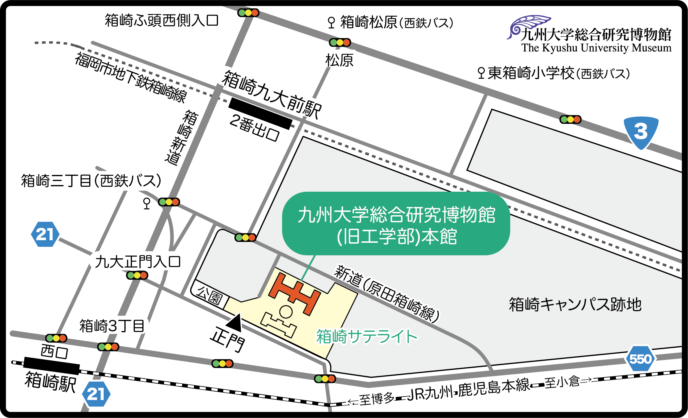 ●福岡市営地下鉄「天神駅」 →「中洲川端駅」→「箱崎九大前駅」下車→2番出口→新道側入口(徒歩約6分)or正門(徒歩約10分)