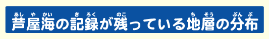 古い海、芦屋海の記録は,北部九州や山口県西部に地層として残されています.下の図の、黄緑色の部分が、芦屋海の記録が残っている地層、芦屋層群です。福岡市周辺だと、百道浜と津屋崎にあることが、わかりますか?(赤い矢印)この芦屋層群からは、生痕化石がたくさん見つかり、そこが海だったということがわかります。