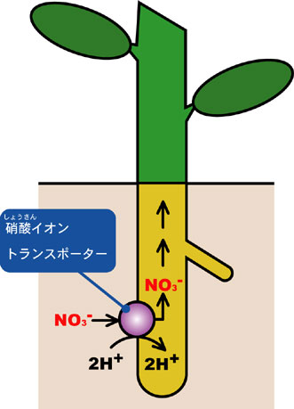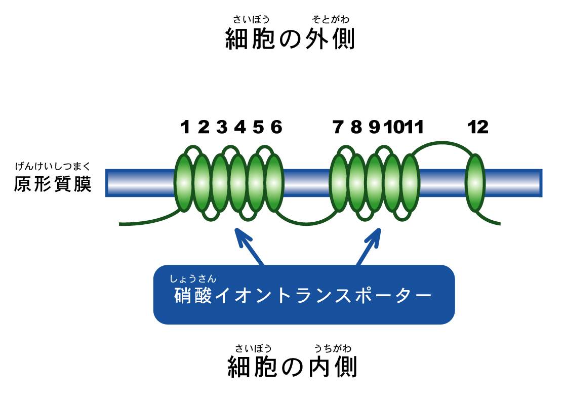サツマイモの硝酸イオントランスポーター 硝酸イオントランスポーターは根の細胞の原形質膜に存在し、窒素成分の吸収を行うタンパク質です。 |