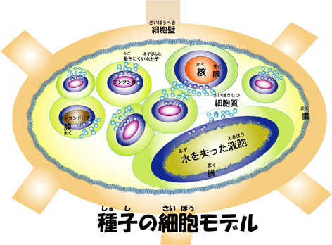 | 種子の胚の細胞では、液胞が水を失い始めると、中にはタンパク質がたくさん貯まってきます。細胞質にも、色々な「膜」を守る蛋白質が作られてきます。また、胚乳や子葉などでは、デンプンや油などもたくさん貯まってきます。これが、発芽のためのエネルギーとなるのです。チューリップの球根の中のデンプンも同じですね。でも、球根と違って種子の中には水が10%くらいしかありません。種子は水が少ないから長生きできるのです。この「動きにくい水」の状態が大事な膜を乾燥から守っていることがわかりました。 でも、種子が乾燥すると死んでしまう植物もあります。ドングリやアボカドの種子を乾かして土に埋めてみてください。---林の中のドングリの仲間は、湿った土の中にもぐりこんだ種子だけが発芽することができるのです。 種子の中には不思議なことがたくさんつまっています。 |