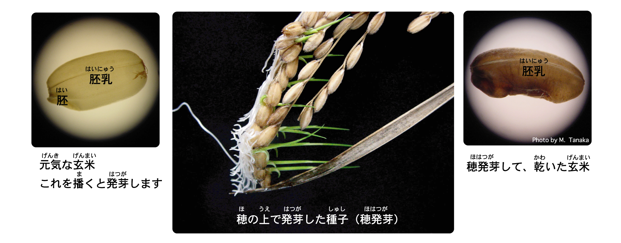 | 皆さんが食べるお米は、左のようなきれいな胚(芽や根が出てきます)と胚乳をもった玄米がもとになりますが、右の玄米は、色も形も変ですね。これは、刈り取り前に降った長雨のため、穂の上で発芽して、その後また乾いた玄米です。そのため、胚がなくなり、胚乳が少し分解されている種子です。 美味しいお米を作るために、穂発芽する「休眠しない」種子を、調べているところです。 |