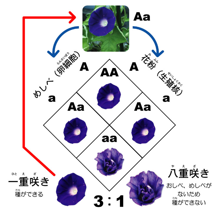 一重咲きの普通のアサガオを作る遺伝子をA、八重咲きのアサガオの遺伝子をaであらわしてみます。変化アサガオの種は一見普通に見える丸い一重咲きのアサガオ(親木)からとります。これは実は八重咲きの遺伝子を隠しもっていてAaで表すことができます。 植物は花粉や雌しべをつくるときに遺伝子の数を半分にします。 そのため、Aaの親からAかaの花粉や雌しべ(卵細胞)が1:1の割合でできてきます(メンデルの分離の法則)。これがこの表の組み合わせで受粉するので、AA、Aa、aaの遺伝子をもつ子どもができます。 このうち、Aはaを覆い隠してしまいますので、AaはAAと区別できません(メンデルの優性の法則)。またaaは八重咲きになり種はできません。この一重咲きのアサガオから種をとってまくと、Aaのアサガオからはまたaaの八重咲きが出てくるのです。 |