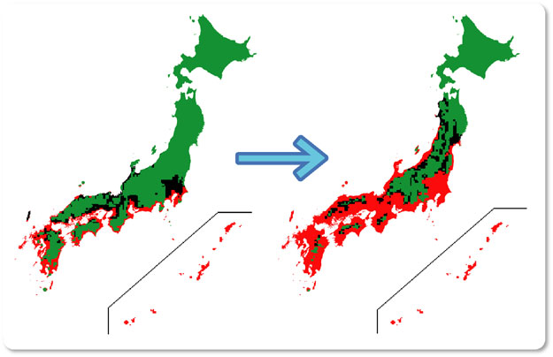 これは、農業植物にも大きな影響を及ぼすよ。左の図は、温暖化前(20世紀末)、右の図は温暖化後(21世紀末)の植生の変化を表しているのだ。赤は暖地型牧草(C4植物)、緑は寒地型牧草(C3植物)の適地だ。