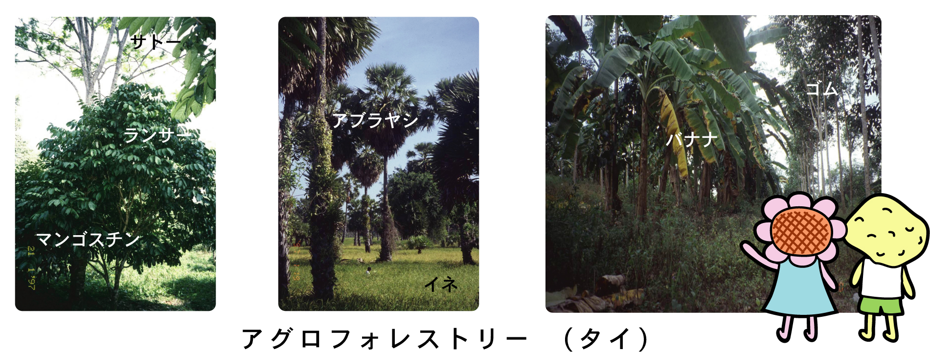 人間は世界中のあらゆる所で生活して、農業活動を行っています。熱帯から寒帯まで、海抜0 mから4000 mの高地までさまざまな作物(植物)を栽培して食料を得ています。したがって、そこで生産される作物の種類、農業の形態も非常に異なっています。 熱帯湿潤地帯ではヤム、タロのイモ類、バナナそして稲が作られています。乾燥地帯では豆類やソルガムなどの雑穀が作られています。草地を求めて移動する遊牧なども、この地帯の特徴です。温帯では麦類を中心に各種野菜が作られています。寒冷地帯では麦類、ジャガイモなど低温に適応した作物が作られています。 この分類は水平的な分類ですが、垂直的な分類もあります。たとえば、南米のアンデス山の高度差によるイモ類の起源の違いは面白く、海抜0 mの熱帯湿潤地域ではキャサバ、2000 mの温帯気候ではサツマイモ、3000 mの冷涼地ではジャガイモが発達しています。また熱帯では、土地生産性をあげるために異なった作物を同一箇所に植える混作(間作)、作物と木本類を組み合わせるアグロフォレストリーなどがあります。 |