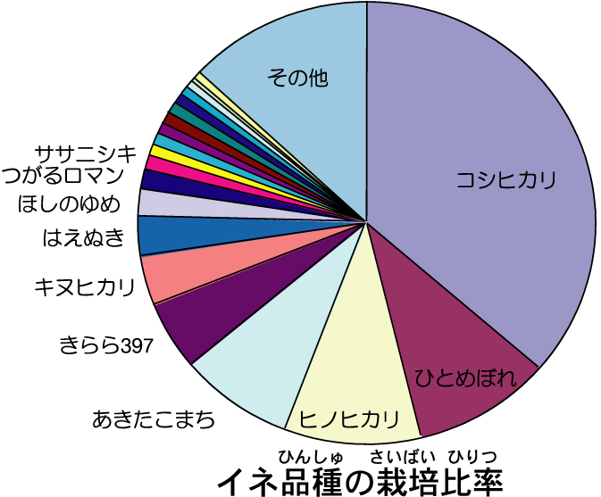 日本全国では170万ヘクタールでイネが栽培されています。コシヒカリを筆頭に上位10品種で約80%を占めます。