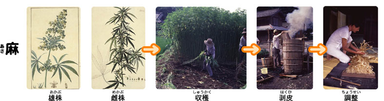 (註)麻の図・写真は九州大学・大学院薬学研究院の正山教授による。 綿の花の写真は青木繁伸氏による。綿の収穫(米国)の写真は九州大学・大学院農学研究院の鄭助手による。