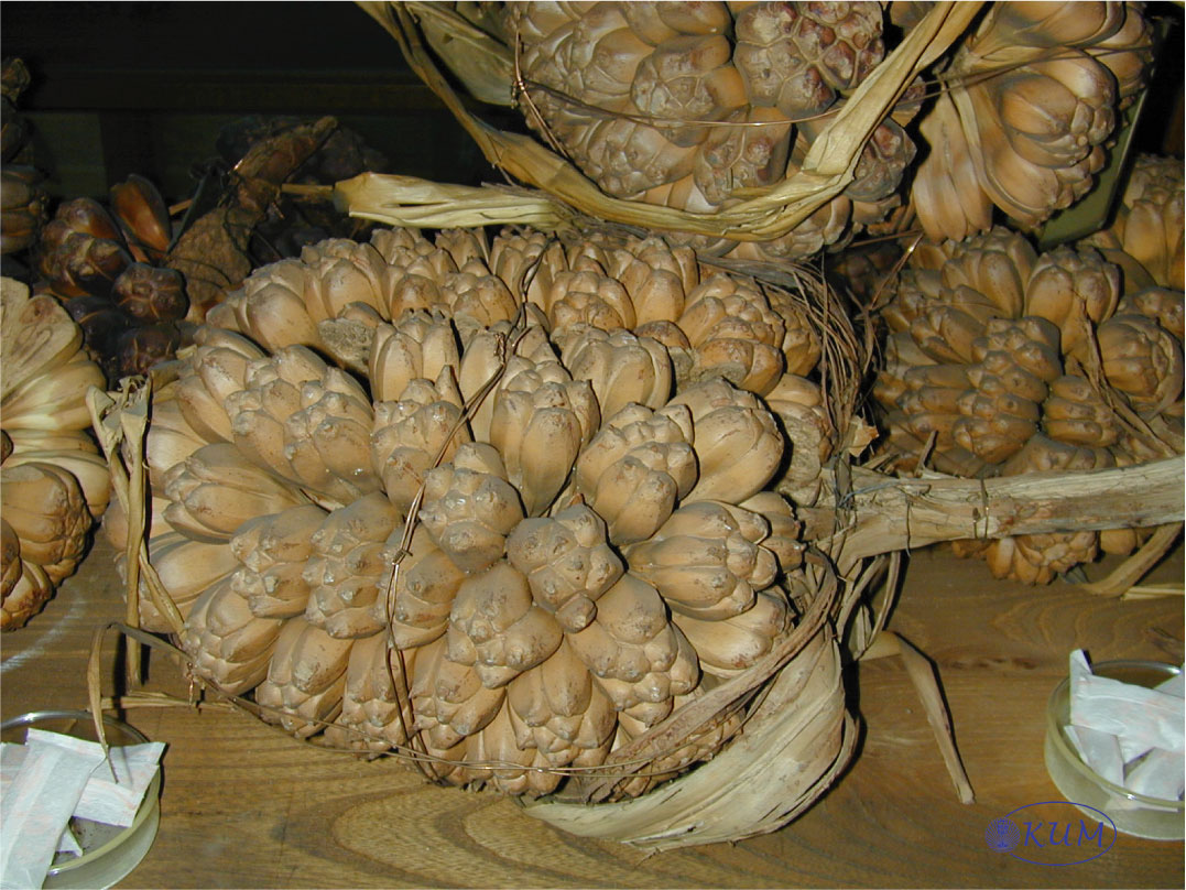 特に、昭和前期に当時の農学部の金平教授らによって採集された南洋群島のタコノキ類の果実標本が充実しています。 タコノキの実は大きく、中には10Kg近いものもあります。彼らは、大きな実は半分に切るなどして、現地で火にあぶって乾燥させてから持ち帰ってきました。まだ未開の現地での行程や、当時の運搬能力を考えれば、大変な作業であったことでしょう。