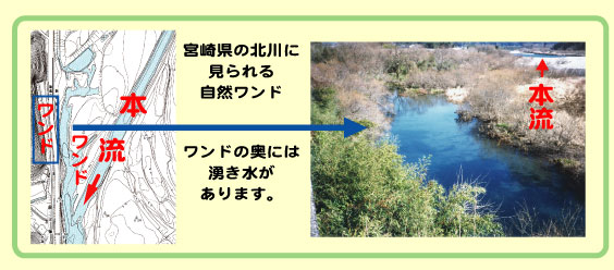 | ワンドって何だろう? 耳慣れない言葉だけれど、漢字では湾処と書き、小さな入江を意味します。入江なのでワンドの中の水の流れはとてもゆるやかです。下の図と写真は自然にできたワンドです。 | |