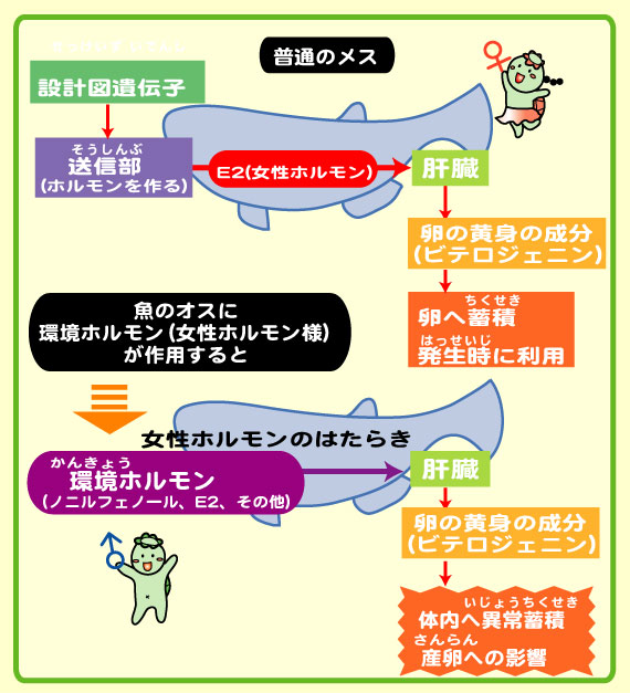 | 私たちが使った化学物質はその後どうなるのでしょうか?考えたことがありますか?最近安全だと思っていた洗剤や薬が川や海に流れてゆき、そこに棲む生物に影響を与えていることが報告されています。例えば、ノニルフェノールという洗剤の分解物は、オスの魚に卵を作らせる作用があります。また、船の底にカキ等が付かない様に塗られたトリブチルスズという物質は、イボニシという巻き貝のメスをオス化する作用があります。これらの物質はオスとメスの性を混乱させる作用があり、環境ホルモンと呼ばれています。 |