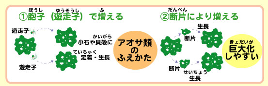 | なぜこのようにアオサ類が大量に増えるのか? 海藻類も植物で、海水中の栄養塩(C 、N やP)を利用した光合成をおこない生活しています。大きな都市を控えた内湾域では、生活排水などからでる栄養塩が余るほどたくさんある状態になっています。これを「富栄養化」といいます。富栄養化した海は、アオサ類にとっては格好の生育場所です。アオサ類は胞子で個体数を増やしますが、体がちぎれて増えることもできます。体の断片は、栄養がたっぷりある所ではとても早く成長でき、2,3 日で大きさが倍になるほどです。ですから、どんどん増えることになります。 |