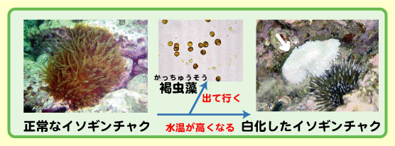 | 色がなくなったイソギンチャク イソギンチャクの中には褐虫藻という藻のなかまが住んでいます。この褐虫藻は温かい水に弱く、29℃以上になるとイソギンチャクから出ていってしまいます。こうなると、イソギンチャクは、それまでの褐色からまっ白になり、死んでしまうものもいます。 |