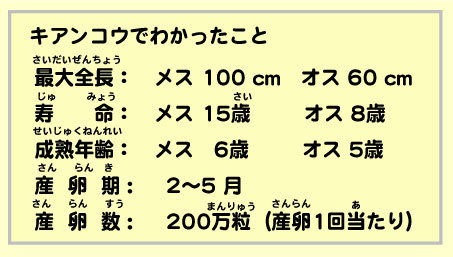 | アンコウ 8年で雄28cm、雌34cm。親せきのキアンコウはアンコウより大きく、8年で雄 55cm、雌66cm になる。どちらも冬においしく、ちり鍋、あんこう鍋、湯引きなどにされる。 |
