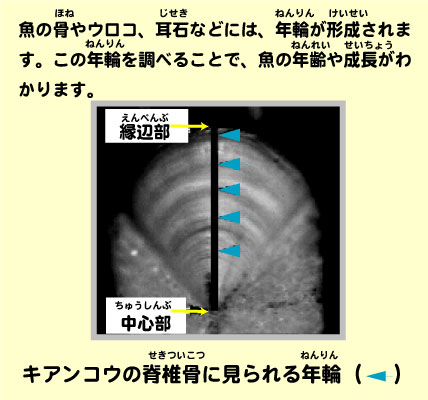 | 限りある水産資源を末永くに守り利用するためには、資源の状態を正しく判断する(資源評価)ことが必要です。そのためには、対象となる魚について、年齢、成長、産卵、回遊などの生物特性や、資源量が環境や漁獲によって変わる仕組みを詳しく調べる必要があります。 | |