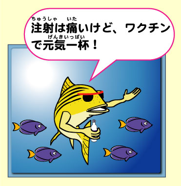 | 養殖魚は、狭い「いけす」で育てられるために、病原体に感染すると、その病気が広がりやすい環境に置かれています。現在、このような病気(魚病)によって毎年多くの養殖魚が失われています。抗生物質などの薬を餌に混ぜてあたえていますが、これらの薬が魚の体内に残留すると、その魚を食べる人にも薬が取り込まれてしまいますね。 人間は、インフルエンザ、結核、はしかなど、伝染しやすい病気を、予防接種(ワクチン)で防いでいます。これは体内に侵入してきた微生物に対抗する、免疫システムがワクチンで強力に働くようになるためです。海洋生命化学講座では、この原理を魚に応用して、薬を使わないで病気を予防し、健康な魚を育てる研究を進めています。また、特定の病原体にだけ効くワクチンだけでなく、いろいろな病原体に対する魚の抵抗力を上げるために、さまざまな免疫強化物質も開発しています。 |