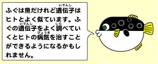 | 遺伝子って何か、知っていますか。その本体はDNAです。DNAはA,T,G,Cという4つの物質からできています。DNAの並び方は、体の中で大切な働きをするタンパク質の設計図になっています。最近、ヒトやいろいろな生き物のDNAの並び方が分かったので、これからは、それぞれの遺伝子がどのような働きをするのかを調べることができます。私たちは、小さな熱帯魚(ゼブラフィッシュ)をつかっていろいろな遺伝子の役割を調べ始めています。また、魚ではフグの全部の遺伝子が最初にわかりました。それはフグの遺伝子の数が少なく、ヒトの遺伝子とよく似ていたからです。魚でみつけられた遺伝子は、魚のためばかりでなく、ヒトの病気の研究にも役立ちます。 | ||