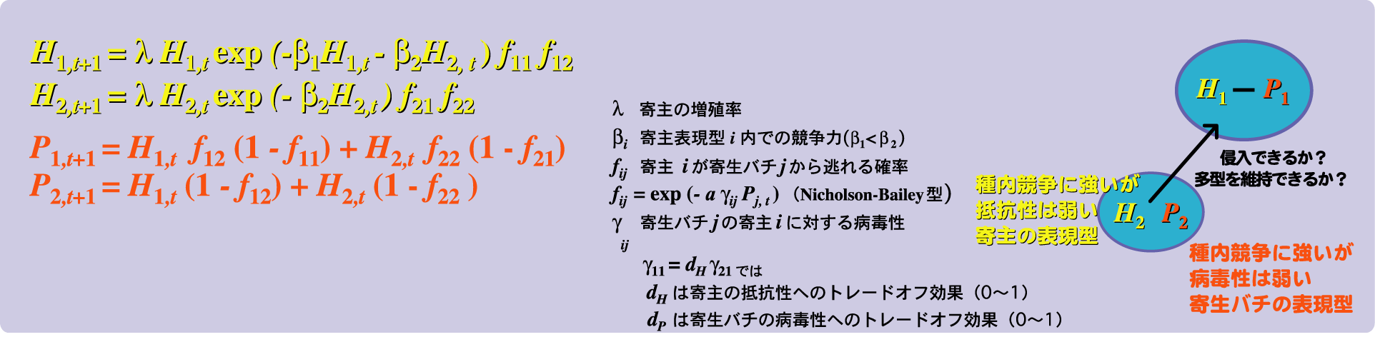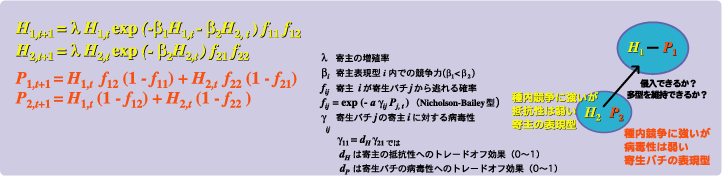 | 種内競争力と抵抗性(または種内競争力と病毒性)の間のトレードオフが寄主-寄生蜂系の動態と共進化に及ぼす影響をモデルで解明します。 抵抗性が種内競争力とトレードオフすると仮定した初めてのモデルです。 |