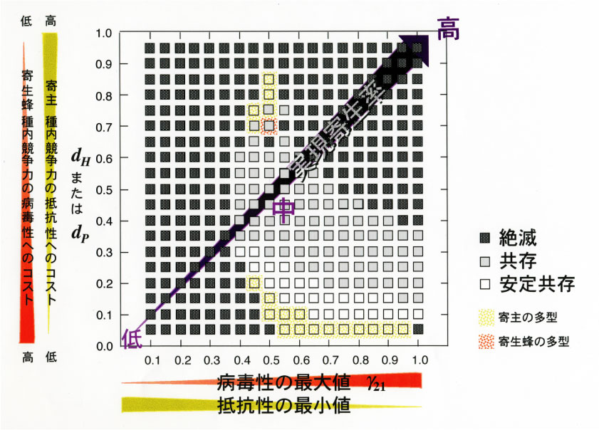 | 実現寄生率 寄生率は、高過ぎても低過ぎても絶滅が起き、中くらいのとき寄主と寄生蜂が共存できました。 トレードオフ 中くらいの寄生率の時、寄主集団のトレードオフは寄生バチとの共存に重要であることがわかりました。寄生バチ集団のトレードオフはあってもなくても絶滅に影響しませんでした。 多型の維持 寄主集団では多型が維持されやすいのに対し、寄生蜂集団では病毒性の高い系統が最終的に選択され、多型はめったに維持されませんでした。高すぎる寄生率は、系を不安定にし、絶滅が起きるためです。 |
