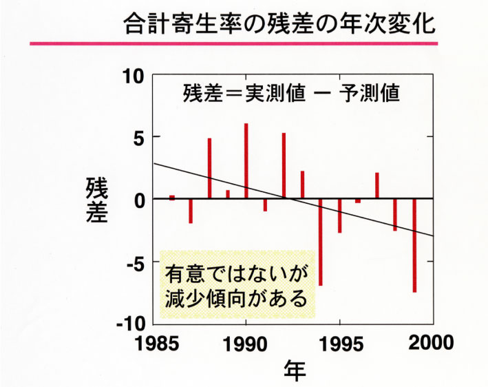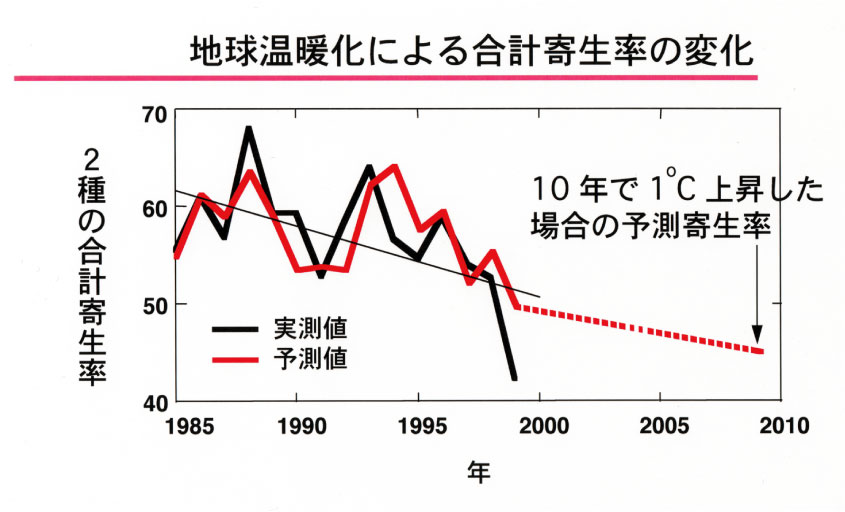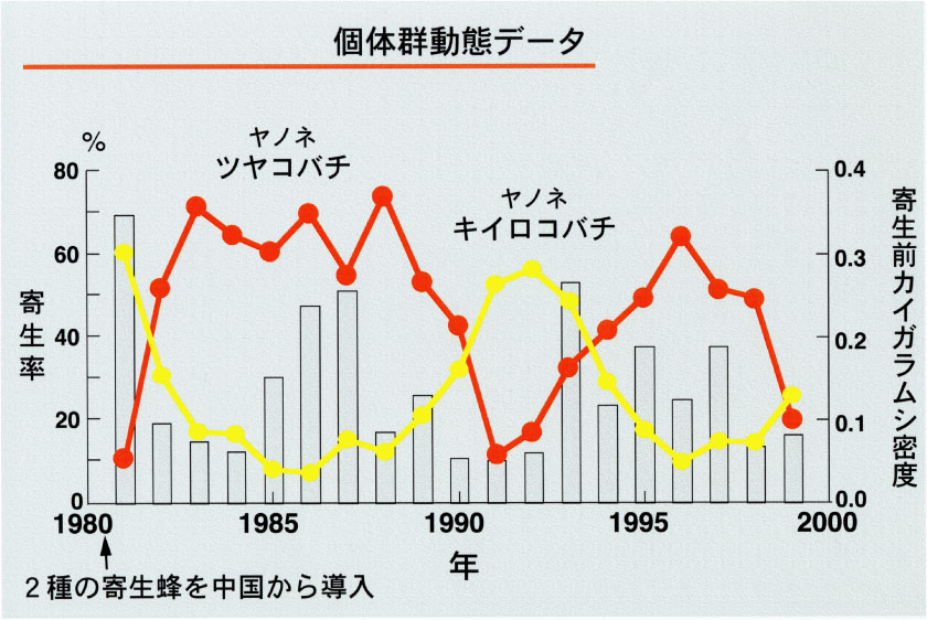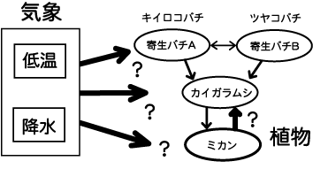 | ミカンを加害するヤノネカイガラムシを防除するため、1980年に寄生バチ2種が中国から導入されました。カイガラムシは激減し、年によって寄生バチ2種が交互に寄生率を上げています。なぜ2種の寄生率はこのように交互に変動するのでしょうか? |