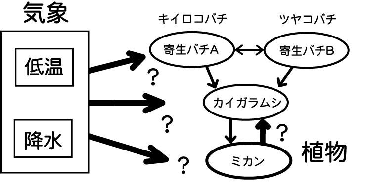 | これまでは、害虫と天敵の生物的要因に主眼がおかれ、気象要因や植物の影響はあまり研究されてこなかったので、本研究ではこれらに注目しました |