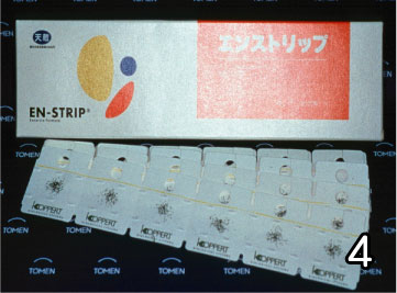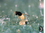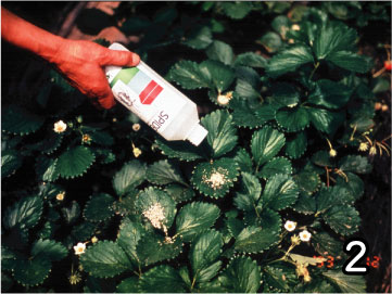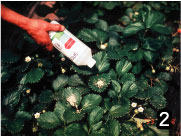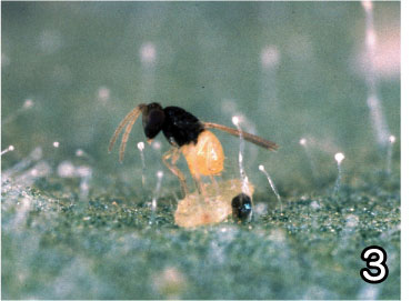 | 写真1 ハダニ類の捕食者、チリカブリダニ 写真2 チリカブリダニの放飼 ボトルにはバーミキュライトと一緒にチリカブリダニが入れてあります。これをイチゴの葉の上に少量ずつ散布します。 写真3 オンシツコナカイガラムシに産卵中のオンシツツヤコバチ 写真4 製品化されたオンシツツヤコバチ オンシツツヤコバチのマミーをのり付けしたシートが市販されています。このシートを1枚ずつちぎって、トマトやキュウリなどの枝に掛けていきます。マミーからはハチが羽化してきます。 |