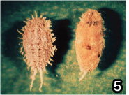 写真5 クワコナカイガラムシ(左)とクワコナカイガラヤドリコバチのマミー(右)