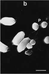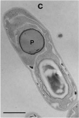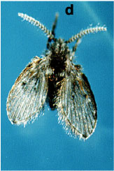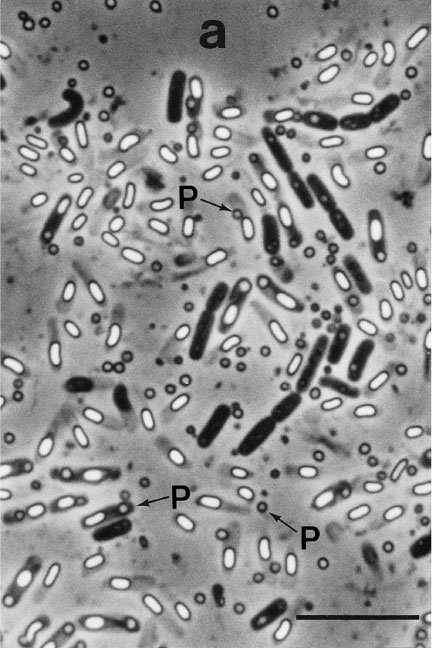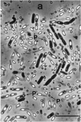 人畜・野生動物に無害な安全性の高い生物農薬のひとつとして昆虫病原細菌 Bacillus thuringiensis (BT) を利用したBT殺虫剤があります。これは対象害虫以外の昆虫 (天敵昆虫や益虫を含む) にも影響が少なく、環境にやさしい殺虫剤と言えます。また対象害虫の範囲はBTの系統によって大きく異なります。たとえばある系統では、農林害虫である鱗翅目昆虫 (チョウやガ) の幼虫のみを殺しますが、別の系統は衛生害虫である双翅目昆虫 (カ、ブユ、チョウバエなど) の幼虫を選択的に殺します。 写真に示したBTは私達の研究グループが高知市の土壌から見つけたもので、衛生害虫の中でもとくにオオチョウバエの幼虫を殺します。このほかにもマラリアカの幼虫 (ボーフラ) を好んで殺すBTの系統や、土壌害虫として知られるコガネムシ類の幼虫だけに強い殺虫活性を示すBTなどが発見されています。 |