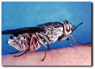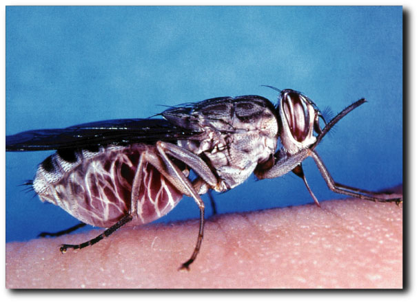 アフリカ睡眠病の病原体であるトリパノソーマという住血性の原生動物を媒介します。このハエは吸血性で人を刺す事により人は感染します。この病気に感染すると感染後2〜3年で末期症状を呈し、中枢神経が犯され歩行、言語障害、次いで昏睡になり多くは合併症を併発して死亡します。