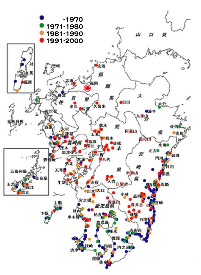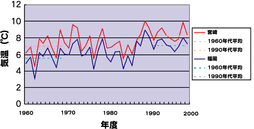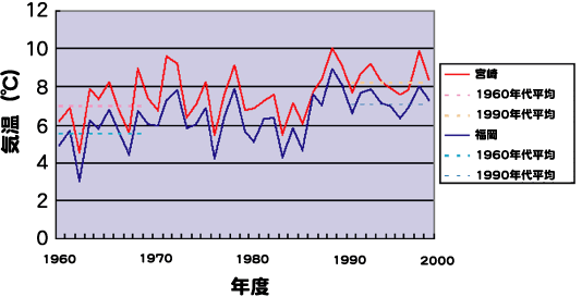 | 平均気温は宮崎と福岡で約1℃違います(福岡管区気象台観測)。そして、ここ30年ほどの間に1℃上昇したため、現在の福岡市は、ちょうどタテハモドキが定着し出した1960年代の宮崎市の気温になっています。すなわち、タテハモドキの定着の基盤ができたといえます。 |