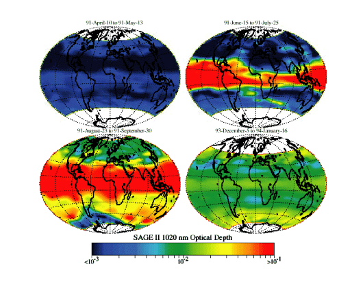 上図はピナツボ噴火後、硫酸エアロソルが全地球規模で拡がっていく様子を示しています(NASAの人工衛星観測による)。左上は噴火前(1991年4月10日から5月13日までの平均)、右上は噴火直後(6月15日から7月25日までの平均)、左下は噴火後3ヶ月(8月23日から9月30日までの平均)、右下は噴火後6ヶ月(12月5日から1992年1月16日までの平均)のエアロソル分布です。