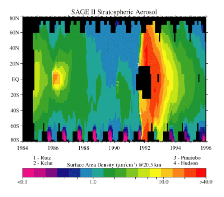 - 1991年6月15日、フィリッピン・ルソン島のピナツボ火山は20世紀最大の噴火を起こし、成層圏中層から下層に多量の硫酸エアロソルを注入しました。噴火規模は、1883年のクラカタウの大噴火に匹敵するものでした(火山噴煙指数=1000)。