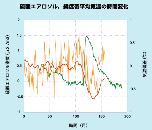 - 上図は北緯30°〜北緯40°の緯度帯の温度偏差(1982年1月〜1990年12月の各月の平均値を基準として、各月の気温から差し引いた値)(橙色の曲線)と、その15ヶ月移動平均(短期変動成分を取り除いたもの)(赤色の曲線)、硫酸エアロソル密度(緑色の曲線)の時間変化を示します。横軸は時間軸(単位は月)で、原点は1982年1月です。硫酸エアロソル密度は、ピナツボ噴火直後から急速に増加して、1991年12月から1992年1月ころにかけて最大値に達し、その後、指数関数的に減少しました。一方、緯度帯で平均した気温偏差は噴火後1年目と2年目の夏に大きく低下しました(約-0.6℃)。