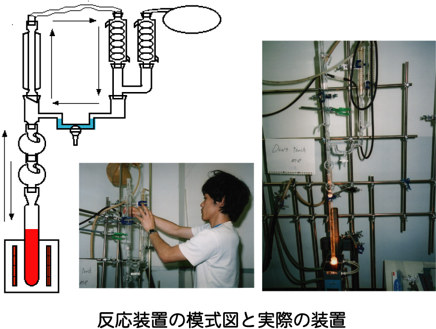 | この装置で900度に加熱しても、水(水蒸気)が装置内に残っていればアミノ酸は一部分解されずに残り、塩基性触媒の存在下、ホルムアルデヒドの重合でわずかながら糖質が生成します。 |
