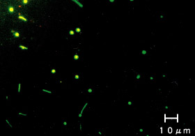 熱水の1滴の顕微鏡写真です。丸いもの(球菌)や細長いもの(桿菌)が見られます。