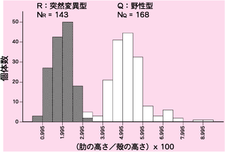 | ヒヨクガイの肋には高い型(野性型、Q型)と低い型(突然変異型、R型)があります。それぞれの型はたくさんの個体について調べると、きれいなつりがね型になります。 |
