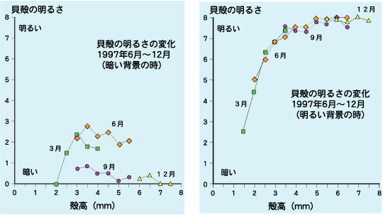| ホリカワタマキビ(巻貝)には、殻の色が明るいものや暗いものがあります。1年間殻の色を調べていくと、次第に住んでいる場所の岩の色に似た個体が多くなります。 |