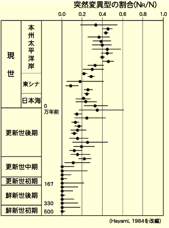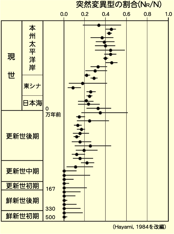 | 鮮新世のヒヨクガイは肋が高いものばかりでした。更新世中期に肋の低い突然変異型が出現して、次第にその頻度が高くなって来ました。 |