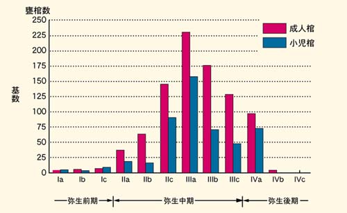 隈・西小田遺跡の時期別の甕棺墓数。弥生時代中期に入ると、ほぼ甕棺だけになり、中期中葉にかけて急増する。