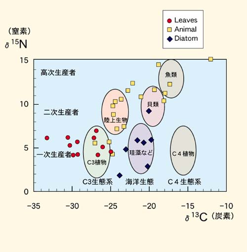 骨や内臓、筋肉など人間のからだは、食べ物からえられた多くの物質からできあがっている。なかでも窒素と炭素はたいせつな役割をはたす。食べ物の種類によってふくまれる窒素と炭素のわりあいはまちまちである。そこで、どのような食べ物に窒素と炭素がどのようなわりあいで含まれているかを調ベ、古人骨に含まれる窒素と炭素の量のわりあいとくらベると、その人物が生きていたときに、どのような食事をとっていたのか、調べることができる。